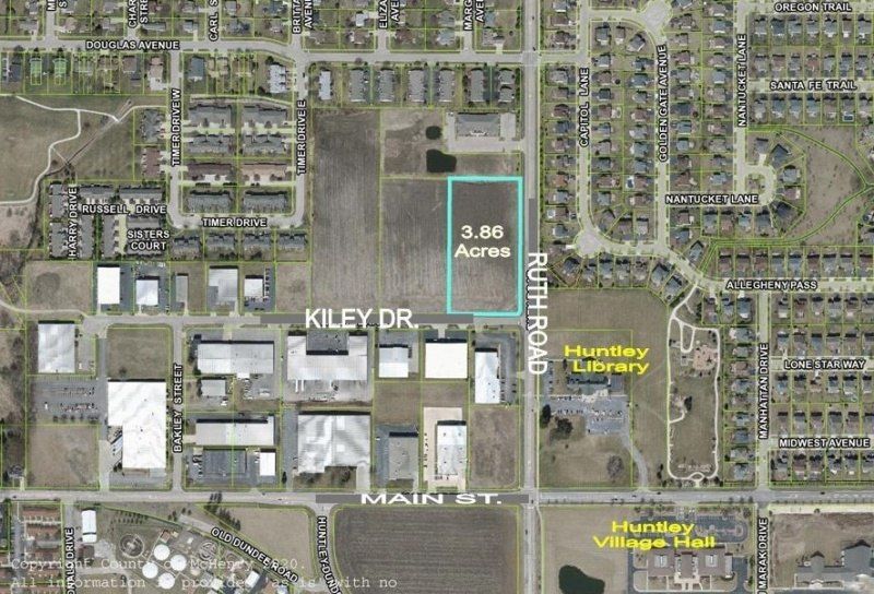 3.86 Acres (168,141 SF) sub-dividable corner lot, located at the NWC of Ruth Road and Kiley Drive in Huntley for sale at $4.13 psf. Currently zoned Office, but eligible for zoning change to Industrial. Parcel has 568' frontage on Ruth Road and 296' of frontage on Kiley Drive. Parcel is within walking distance of the public library and Huntley Village Hall. Solid mix of retail, industrial and office businesses in this emerging Huntley area.