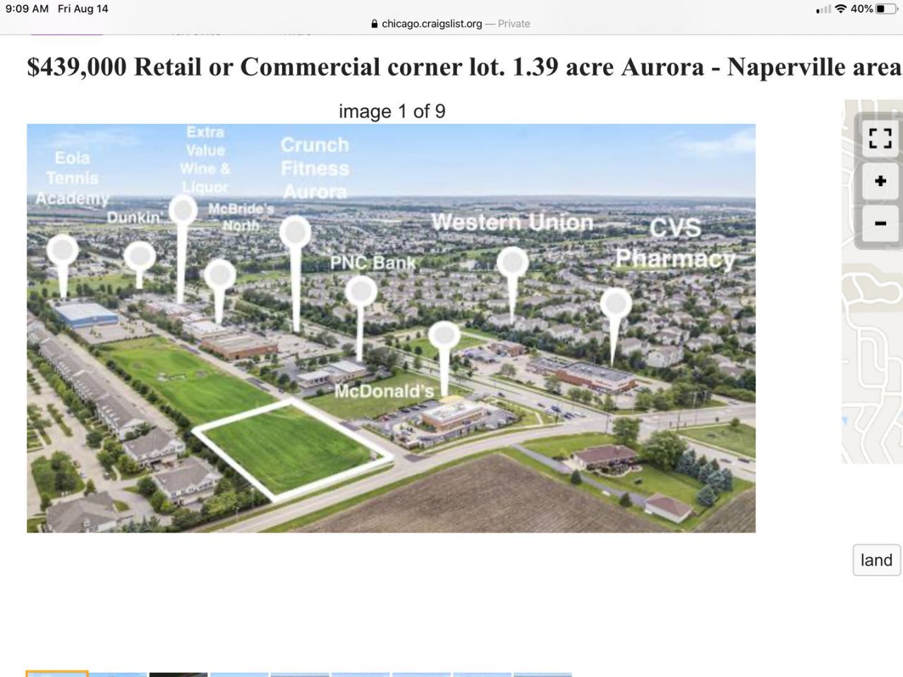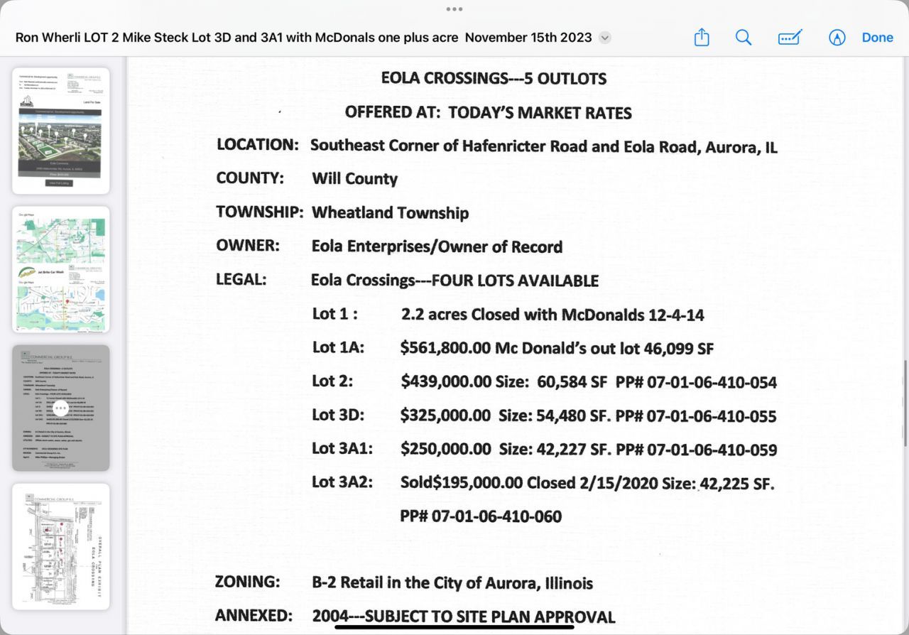 For Sale: Large fully improved 1.39 acre commercial corner lot next to McDonald's! All utilities to site. Detention is in and offsite. Frontage on 2 roads. Suitable for most retail and commercial applications. Well positioned just off Eola Rd with easy access to Rt. 30, Rt. 34 and Rt. 59. Plenty of rooftops in the immediate area! Near schools and parks. Proposed uses may include professional or medical building, daycare, sports training, fitness, school, car wash, retail space and more. Bring your ideas here and grow in this vibrant area. Located in southeast Aurora near Naperville, Plainfield and Oswego. Oswego schools. Need a highly visible commercial building site with houses, schools, restaurants and other retailers nearby? Look no further... See and Compare! Price right for today's market.
