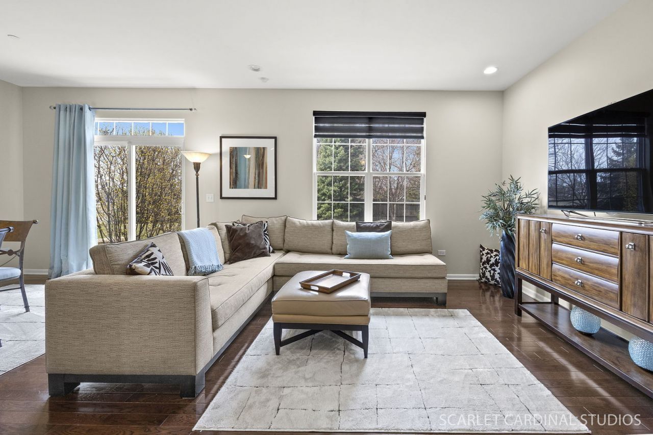 Stunning townhome, light and bright, three finished floors, impeccably maintained by its sole owner - this 2-bedroom, 2.5-bathroom townhome has everything! Gorgeous hardwood flooring throughout the main level, which boasts a large kitchen with stainless appliances and granite countertops with counter seating, walk-in pantry, spacious living room, powder room, and a formal dining space with access to the back patio through the large sliding doors. An open floorplan and picture windows flood the rooms with natural light. Neutral finishes throughout, including dark-stained stair rails with iron spindles to the second-floor loft space (potential third bedroom) and adjacent two bedrooms and two full bathrooms. The large primary bedroom features large windows, an ensuite full bath with double vanity, soaking tub and separate shower, and a well-organized walk-in closet. The fully finished basement features large space for entertaining, a home gym, entertainment or more, with ample storage space and is plumbed for an additional bathroom. Roof replaced in 2022. Furnace and AC replaced in 2025. Acclaimed D204 schools and close to highways, entertainment, and shopping!