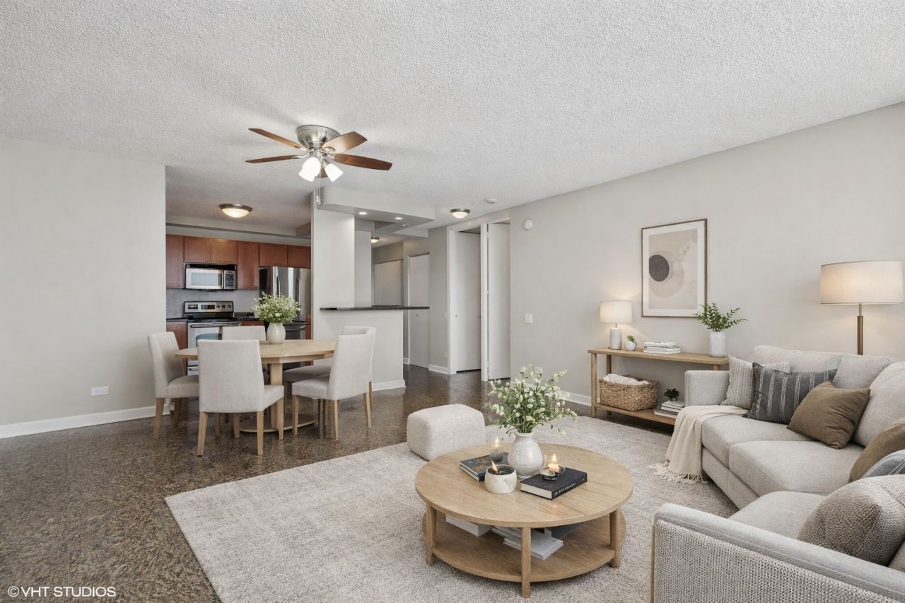 Rarely available high floor 1 Bedroom with IN-UNIT LAUNDRY & Garage Parking at 30 E Huron, in the heart of River North! Absolutely Breathtaking Forever Views of the City & Lake. This is the largest 1 bedroom floor plan in the building & one of the very few that has in-unit laundry. Open layout floor plan with tons of closet space, custom solar shades. Open kitchen with shaker style cabinetry, stainless steel appliances including wine fridge, granite counters & large two level counter island open to living & dining. Spacious living room large enough for separate dining. Huge primary large enough to fit a king sized bed with a walk-in closet. Upgraded bathroom with raised shaker style vanity, ceramic tile, glass shower doors & separate linen closet. New washer and dryer. PRIME Parking Space Additional $25K - Can be rented out. Assessments Include Bulk Cable Package (Over 180 HD Channels), Internet (250MB), Water & Amenities - ELECTRIC IS ONLY OUTSIDE UTILITY. Amenities Include 24-Hour Doorman, Award Winning 2 Story Sundeck & Outdoor Pool That Was Just Renovated, Comprehensive Gym, Biz Center, Theater & Party Room. Financially stable building that's NEVER had a Special & with no rental restrictions! Steps from Magnificent Mile, top restaurants and shopping in the world! Don't miss out on this beautiful unit.