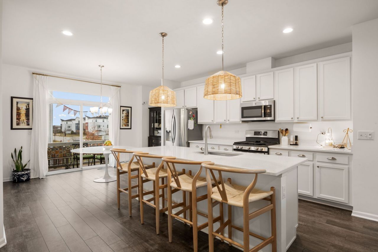 Experience the perfect blend of modern design and tranquil surroundings in this stunning, newer-built townhouse. As a coveted corner unit situated directly next to a lush park and open green space, this home offers a level of privacy and views rarely found in townhome living. The south-facing entrance ensures the interior is bathed in natural light throughout the day, highlighting the airy, contemporary layout. The home features 3 generous bedrooms and 2.5 modern bathrooms, designed with the modern family in mind. The spacious foyer is adjacent to a large entertaining space, with oversized corner windows bringing the outside in. The rich oak rails with white spindles add a touch of elegance to this entryway. Once on the main floor, you land in the center of the open-concept kitchen and family area everybody is after. To the front of the home is the large family room, the middle holds the bright and airy kitchen, and to the rear is a dining room. The wide-planked grey wood laminate floors offer an ideal complement to the 42 contemporary Alpine White cabinets and stunning white and grey quartz countertops. The huge walk-in pantry and over 8' center island are a rare find in a townhome kitchen and sure to please the chef. The spacious eating area is large enough to accommodate a 6-person table and opens up to a beautiful deck where you can overlook the neighborhood while drinking your morning coffee. Tucked in the rear corner of the home is your laundry room, as well as a powder room for your guests. As you make your way to the upper level, you'll find three bedrooms and two full bathrooms. The master suite is the perfect size! You can comfortably fit your king-size furniture set in here and will even have room for some extra furniture and decor. Beyond the convenience of the 2-car garage, you are positioned in a serene neighborhood within the award-winning Naperville School District 204. Enjoy the peace of a quiet community while staying minutes away from the Route 59 corridor, I-88, and premium shopping and dining.